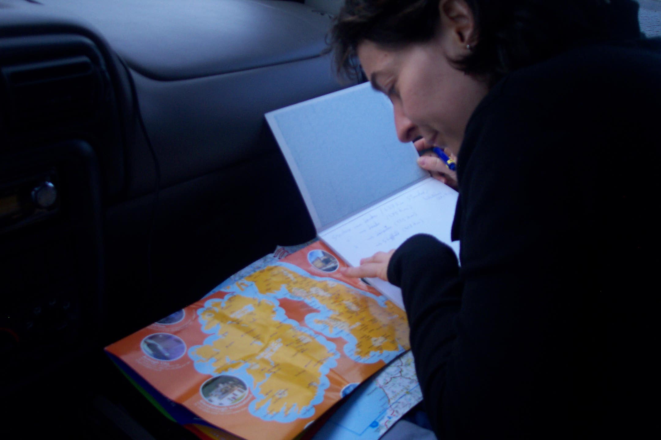Creo que es momento de hablaros de nuestros «navegadores». Yo en la furgo llevaba uno electrónico, Garmin, gracias al cual no tuvimos muchos problemas para movernos sin perdernos durante todo el viaje (o casi). Además de este navegador, teníamos otro (en este caso, otra), no menos eficaz. Creo que la foto lo explica perfectamente. Con su inseparable mapa, hacía a la vez de navegante y de historiadora, recogiendo en su libreta todos los datos de nuestro viaje.