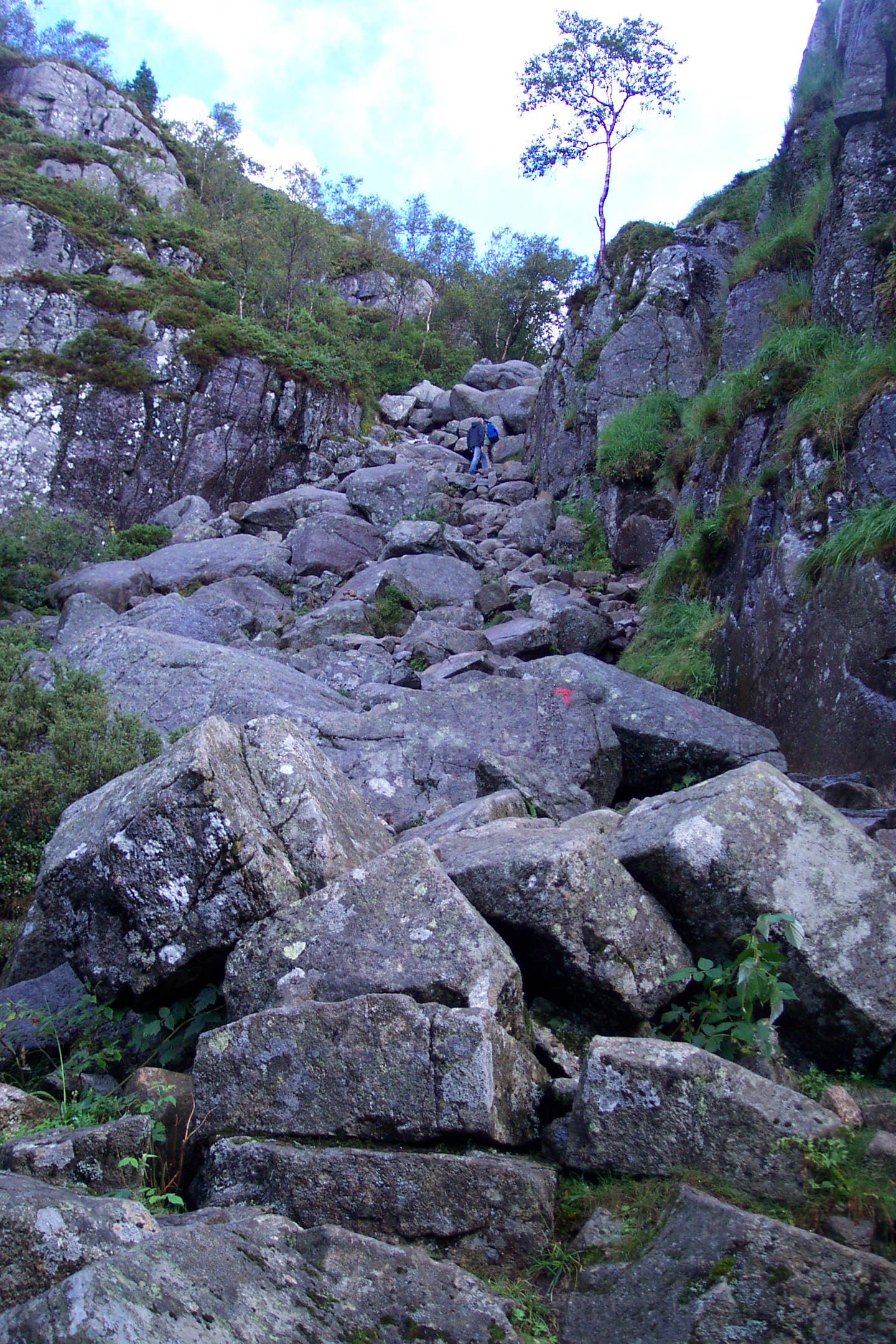 Para poder subir al Preikestolen (“púlpito” en noruego) hay que seguir un camino a través de senderos de montaña y lagos glaciares. No es fácil subir.