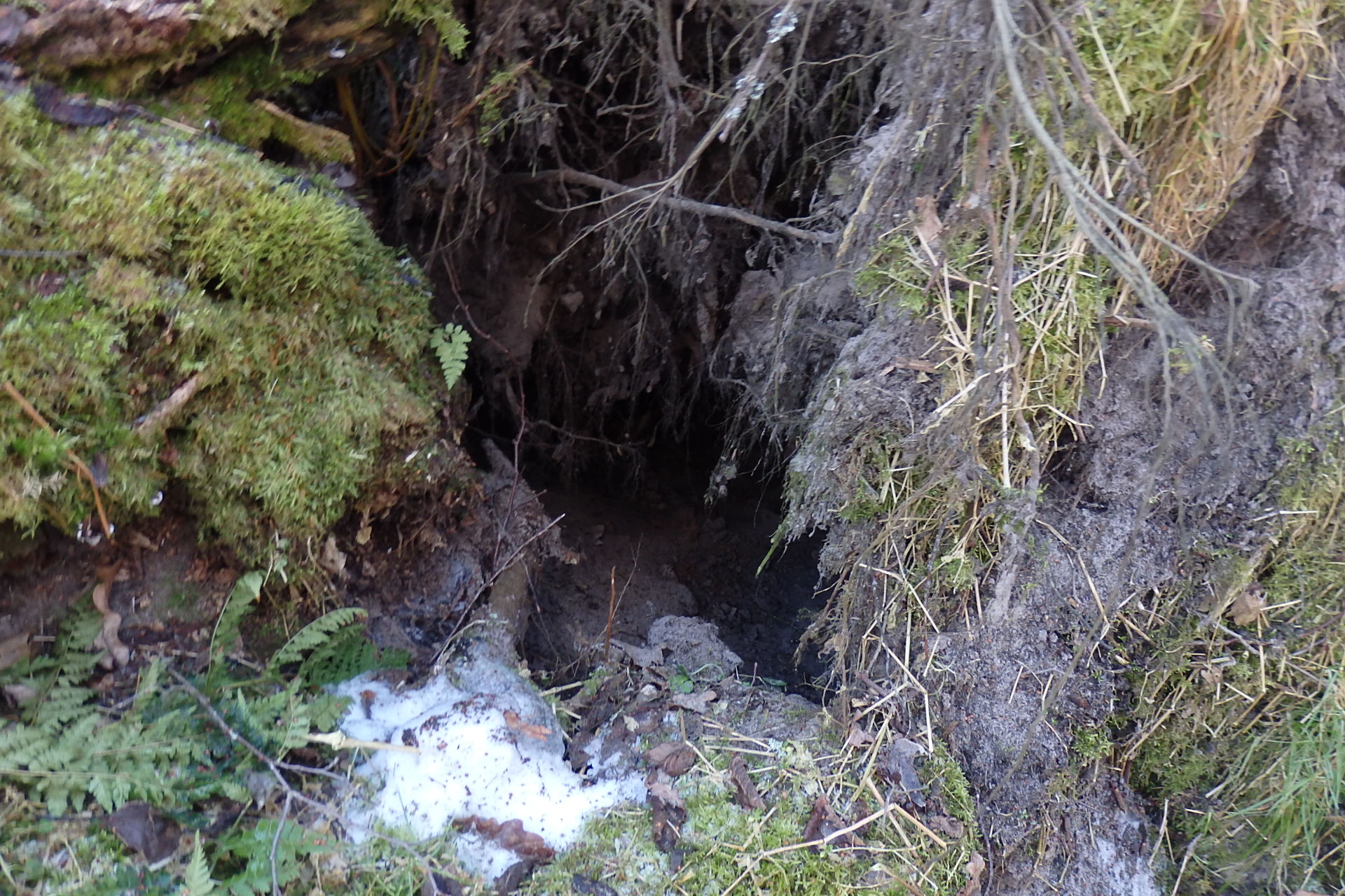 En esa estamos cuando vemos una especie de cueva o madriguera de un tamaño importante.