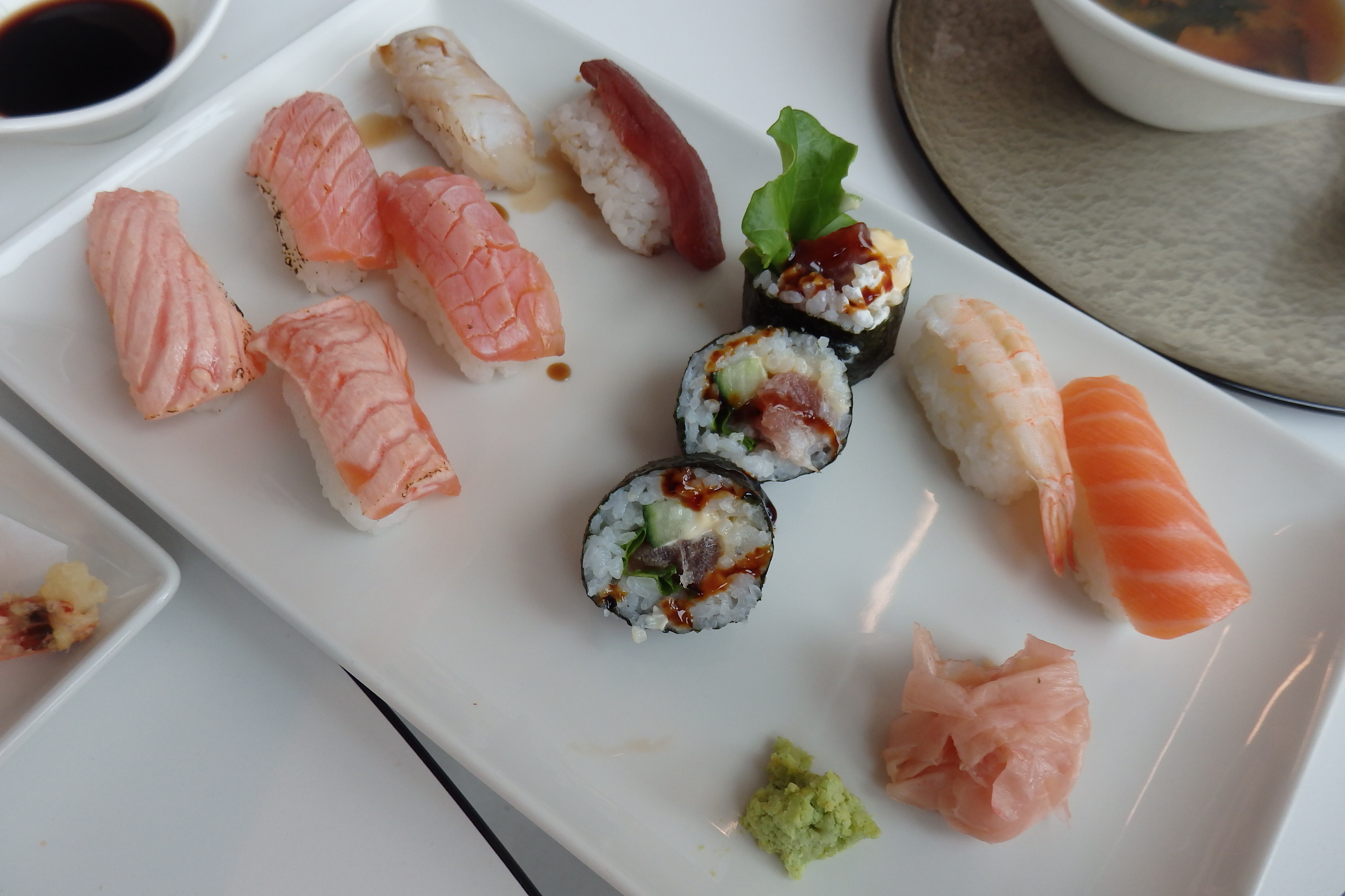 Para finalizar nos traen el variado de sushi. Doce piezas de varios tipos. Hemos ido varias veces al sushi bar del que os hablaba antes, y la verdad, al ver este que nos han traido, nos ha decepcionado. Solo la apariencia echaba para atrás. El sabor, no era para tirar cohetes tampoco. En resumen, un sushi muy normalito, tirando para malo.