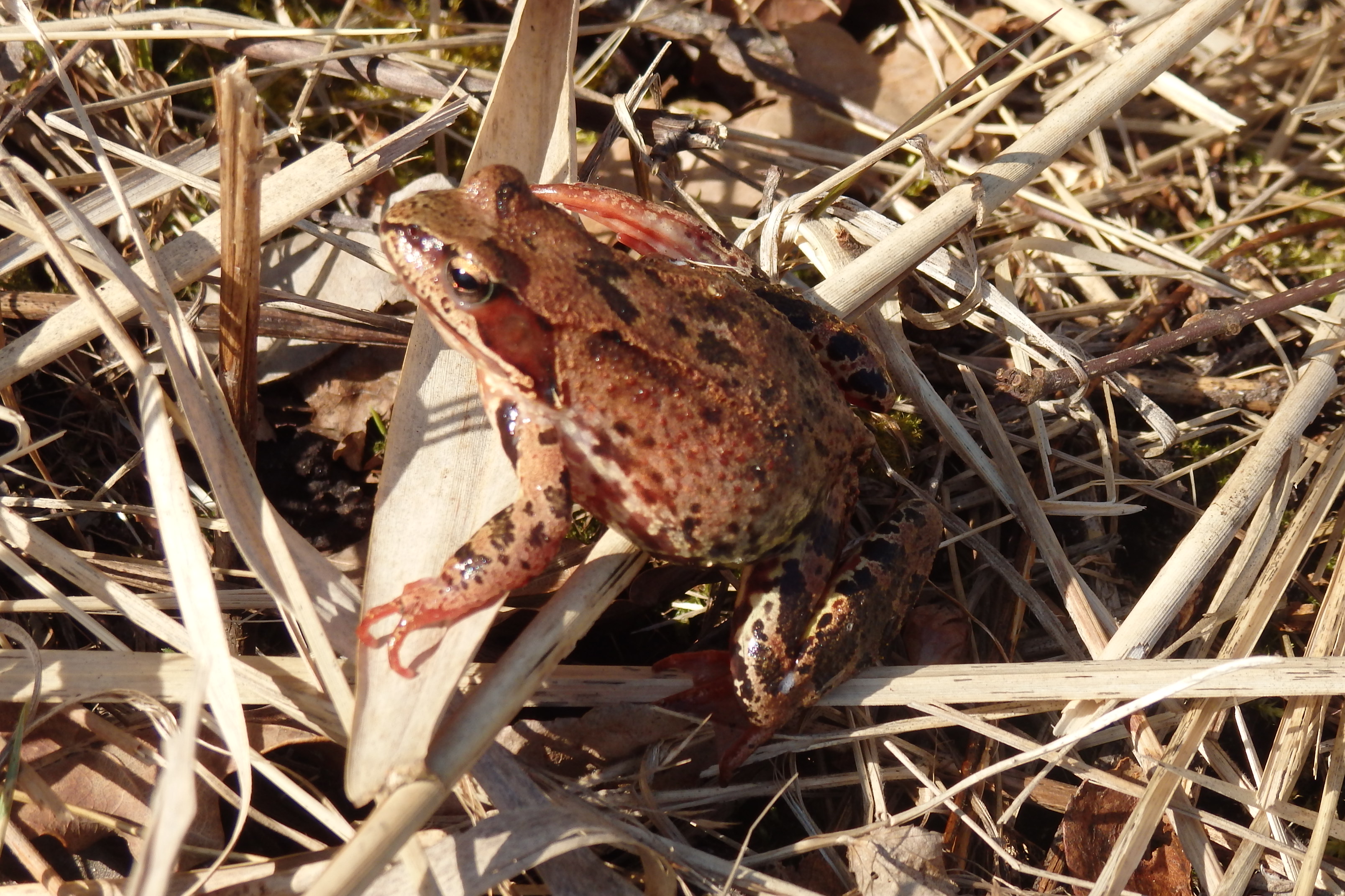 Gracias al pinchazo conocemos a «rana», la cual trata de avanzar torpemente por la vegetación. Con nuestra inestimable y desinteresada ayuda consigue llegar a una charca cercana.