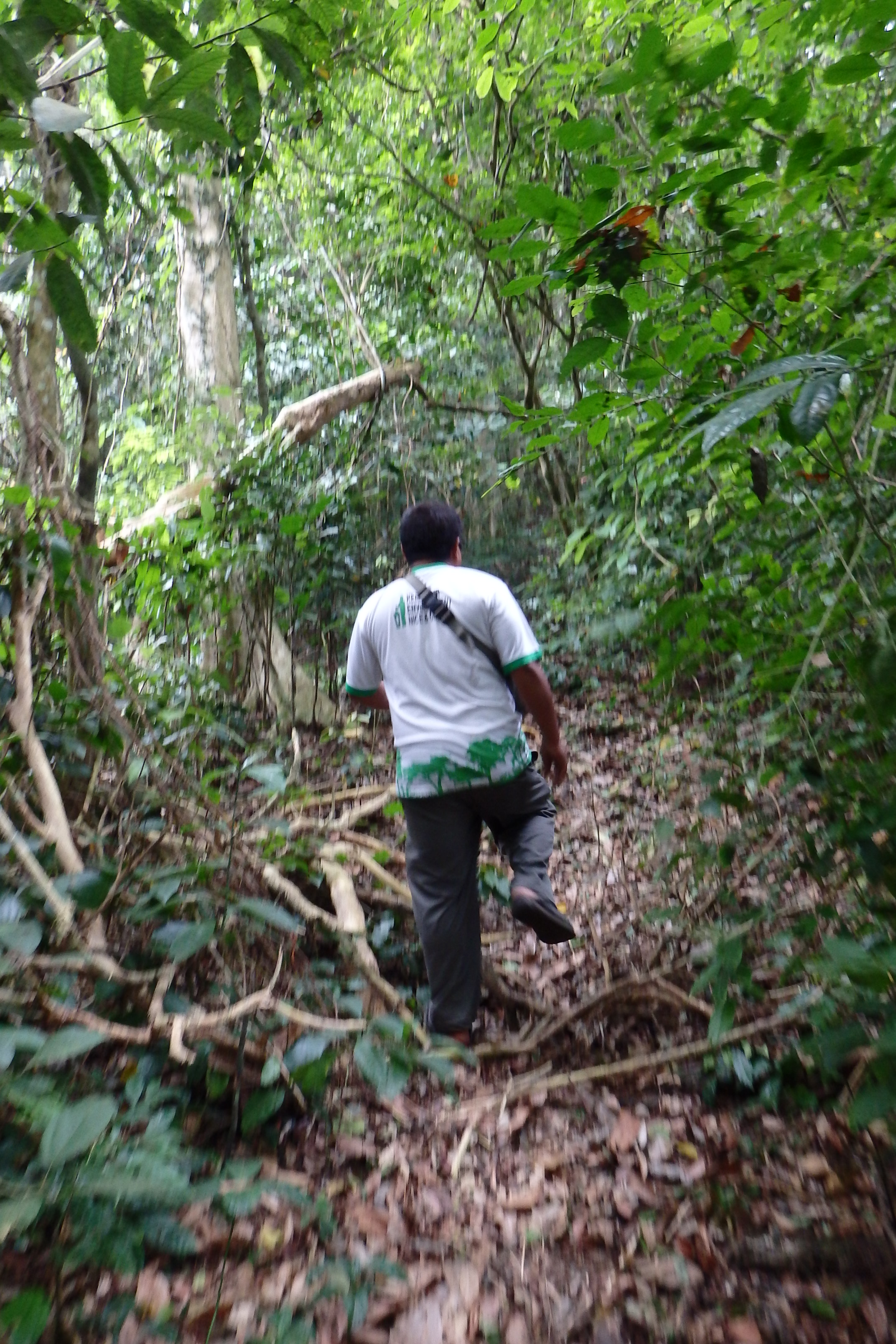 Tras unos 10 minutos llega el señor en cuestión. Es un hombre pequeño pero de piernas rocosas y preparado para paseos por la selva (botas, ropa larga, chubasquero, mochila pequeña) y con un polo con un parche que indica que es un guía oficial del Parque.