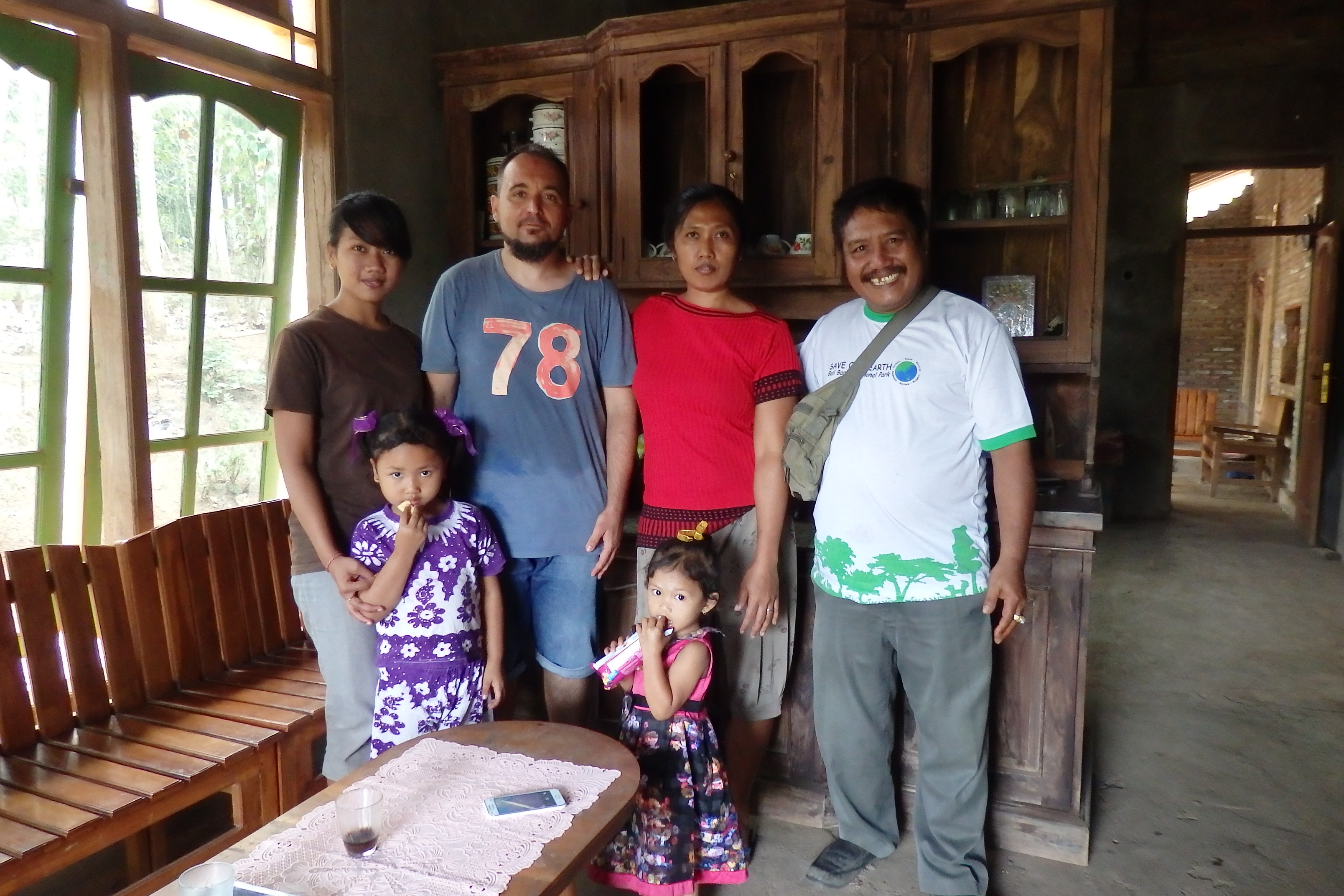 Rápidamente aparece su mujer con dos cafés, y tras presentarla nos ponemos a «charlar» los tres. El es balinés, hindú, ella es de Java, musulmana. Yo les digo que soy católico y todos nos reímos. Me cuenta que vive en esa casa con sus dos hijas y otros niños de un amigo suyo (aquí utiliza la quinta palabra «friend»).