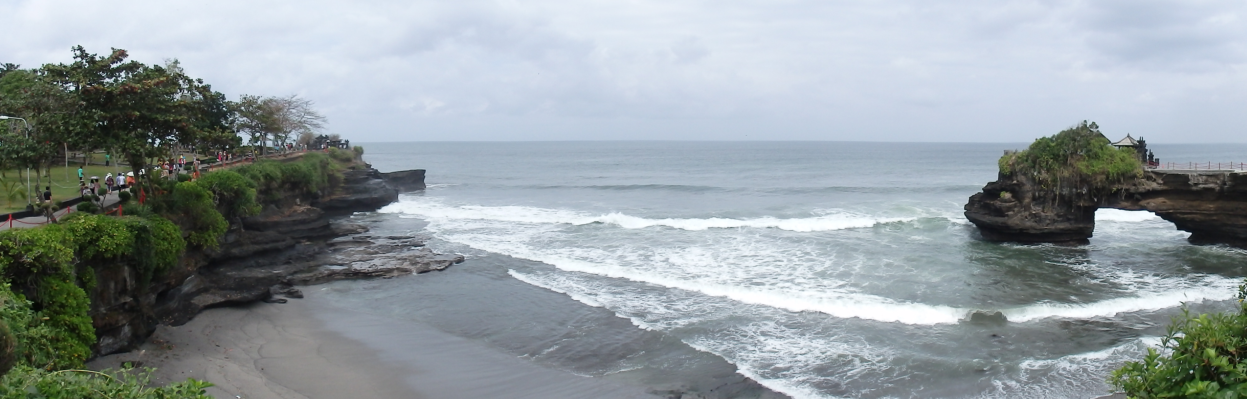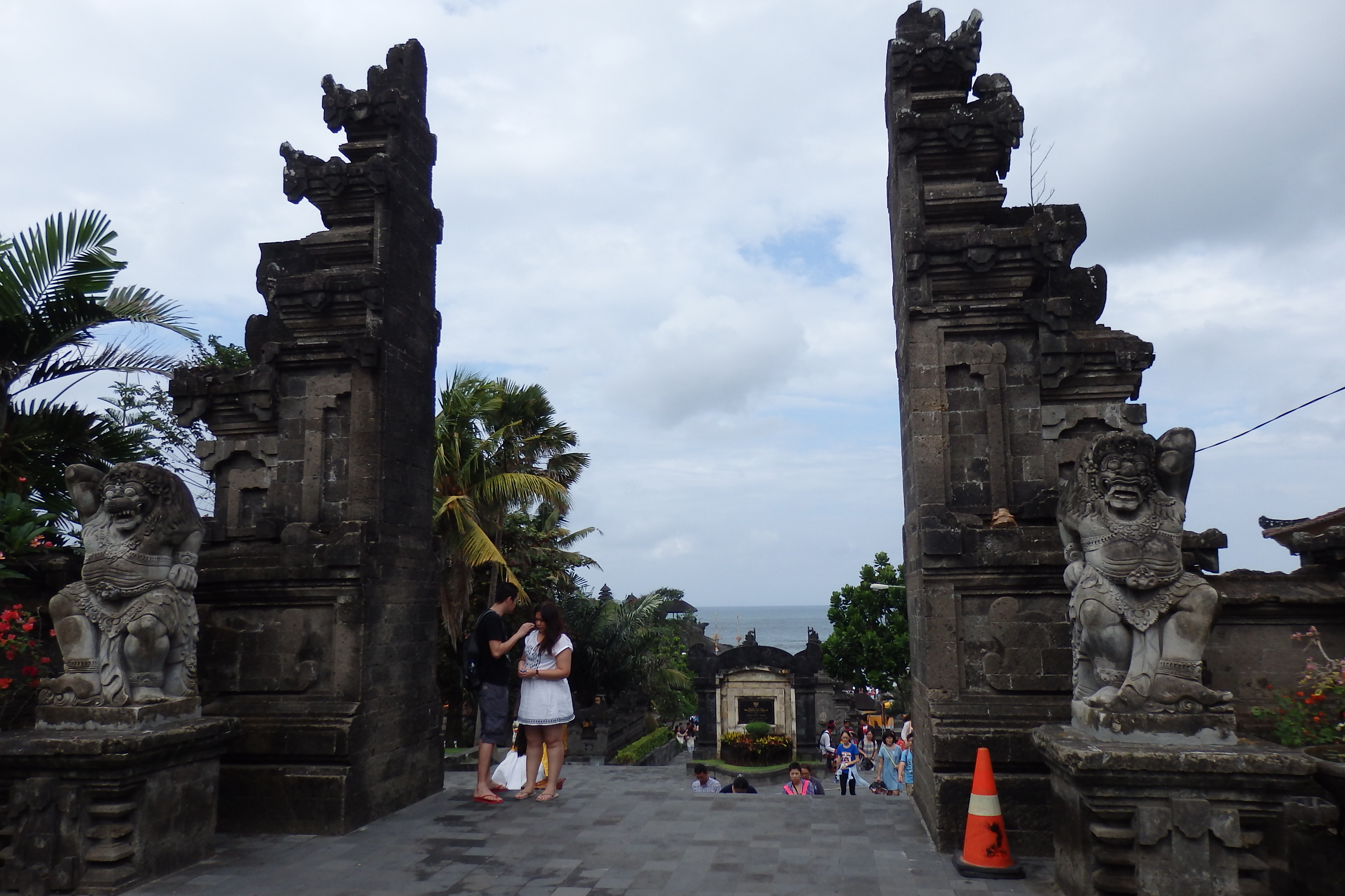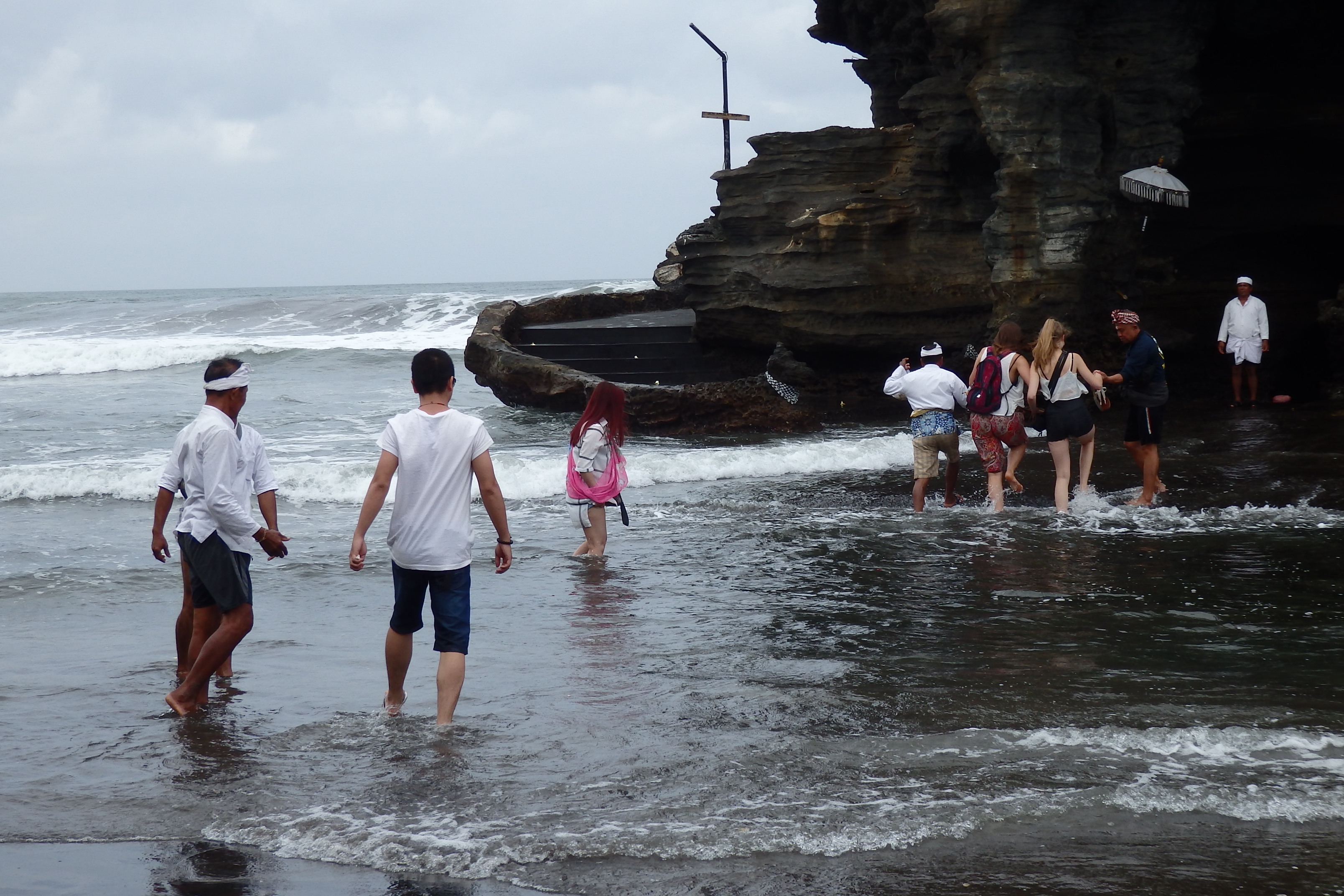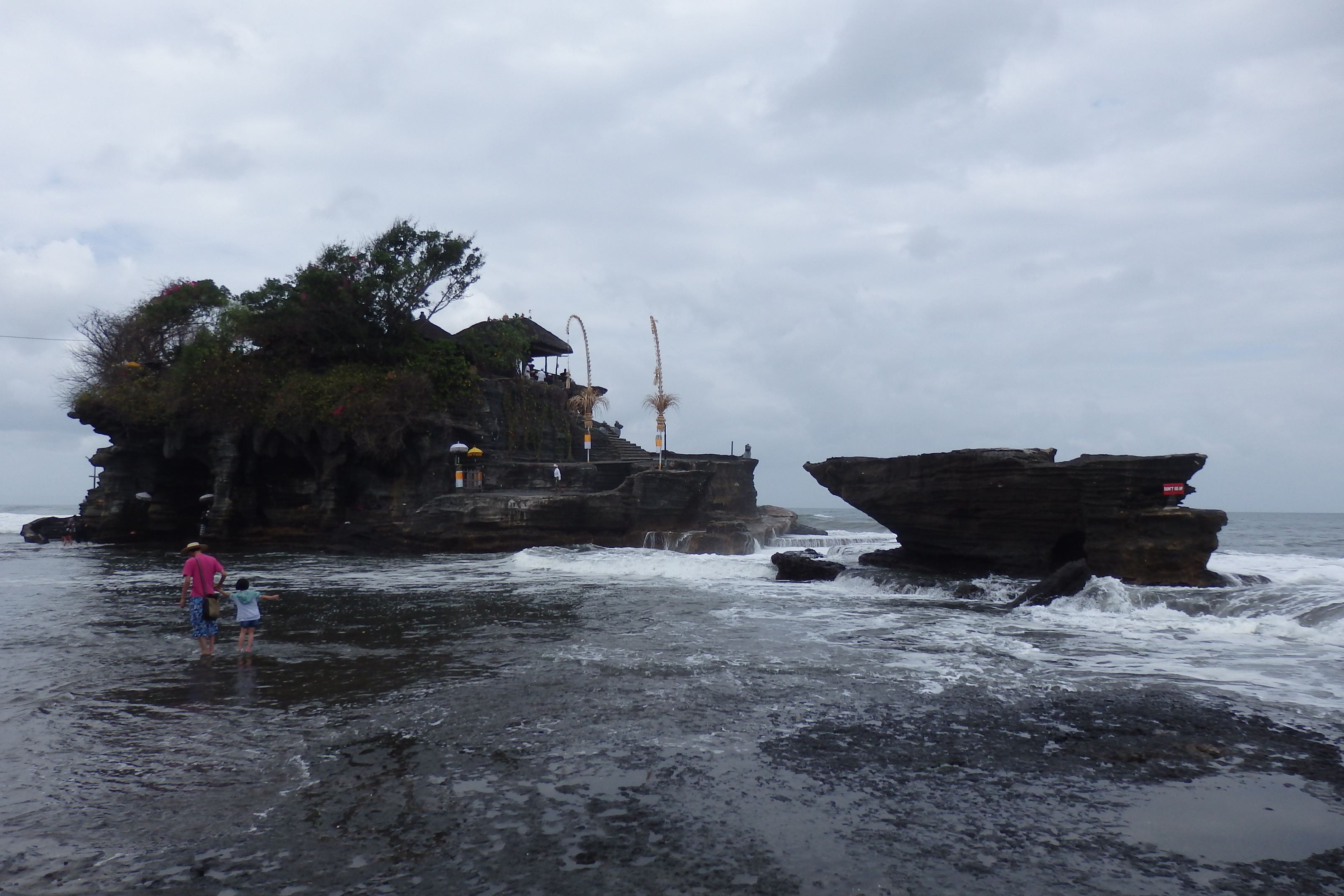 No es que haya podido ver mucho, ya que nada más cruzar hay una cueva con una fuente de agua sagrada, con la que te bendicen a cambio de una pequeña donación. Luego puedes subir unos peldaños de la escalera que lleva al templo, pero no muchos ya que el acceso esta bloqueado. Vaya chasco. He vuelto rápidamente a la playa ya que la marea estaba subiendo muy rápido y no era plan de quedarse aislado en la roca.