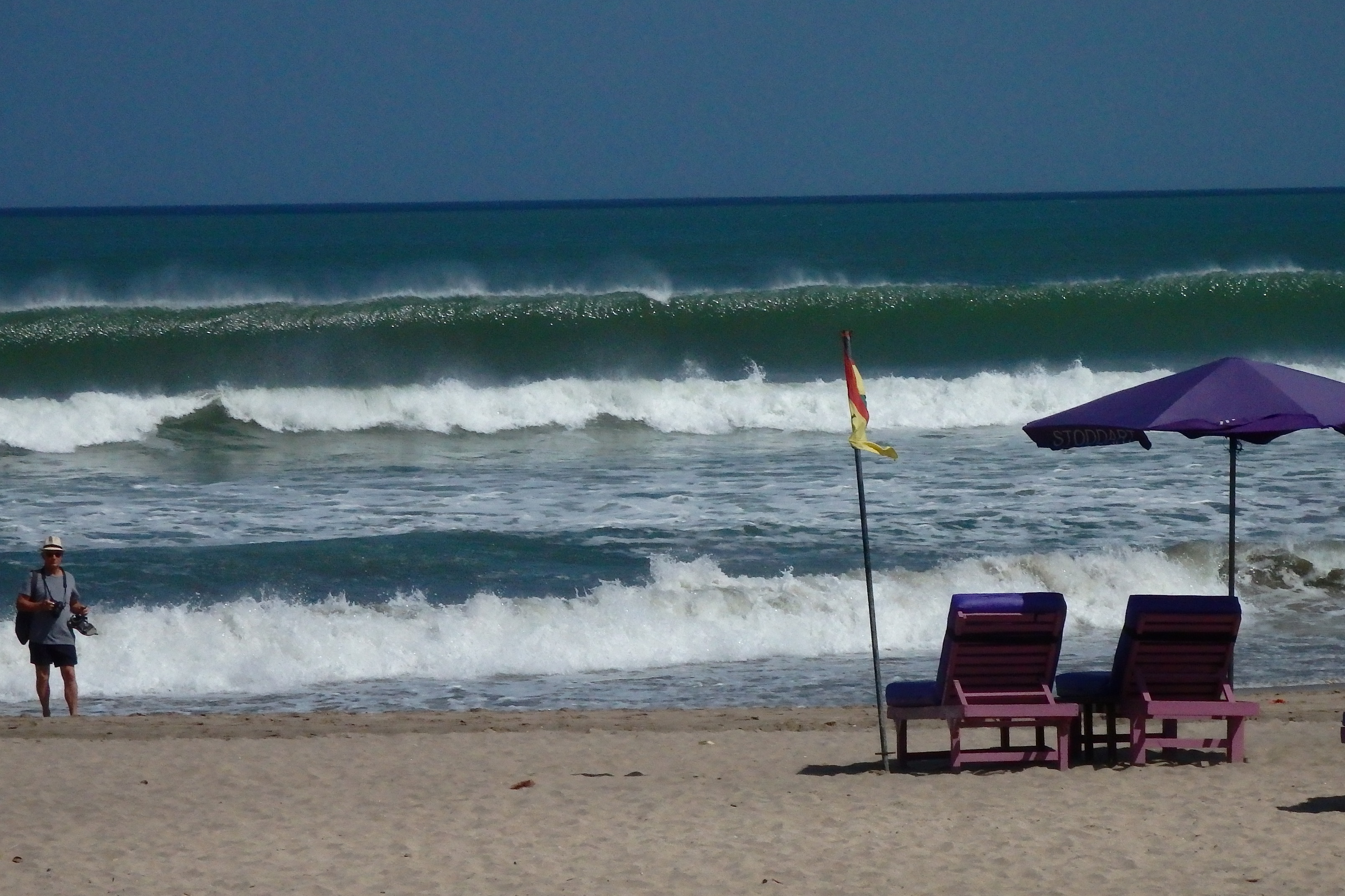 Aunque había bandera roja, había mucha gente en el agua, así que yo me he metido también. Eso si, toda la gente cerca de la costa, donde hacía pie. Si alguien se metía un poco mas, rápidamente venia un vigilante, con su silbato, y lo sacaba fuera. Para que os hagais una idea de como eran las olas, cuando rompian y continuaban hacia la orilla, pasabas de tener el agua por la rodilla a tenerla por el cuello. Y eso que estaba en la misma orilla, muy lejos de donde rompían. La corriente que luego generaban esas olas era tal que era imposible mantener la posición. Unas veces te atraían hacia el mar, como una aspiradora gigante, y otras te empujaban hacia la orilla. No había nada que pudieras hacer, solo esperar a que la corriente parara cuando otra ola volvía a romper, y todo se volvía a repetir.