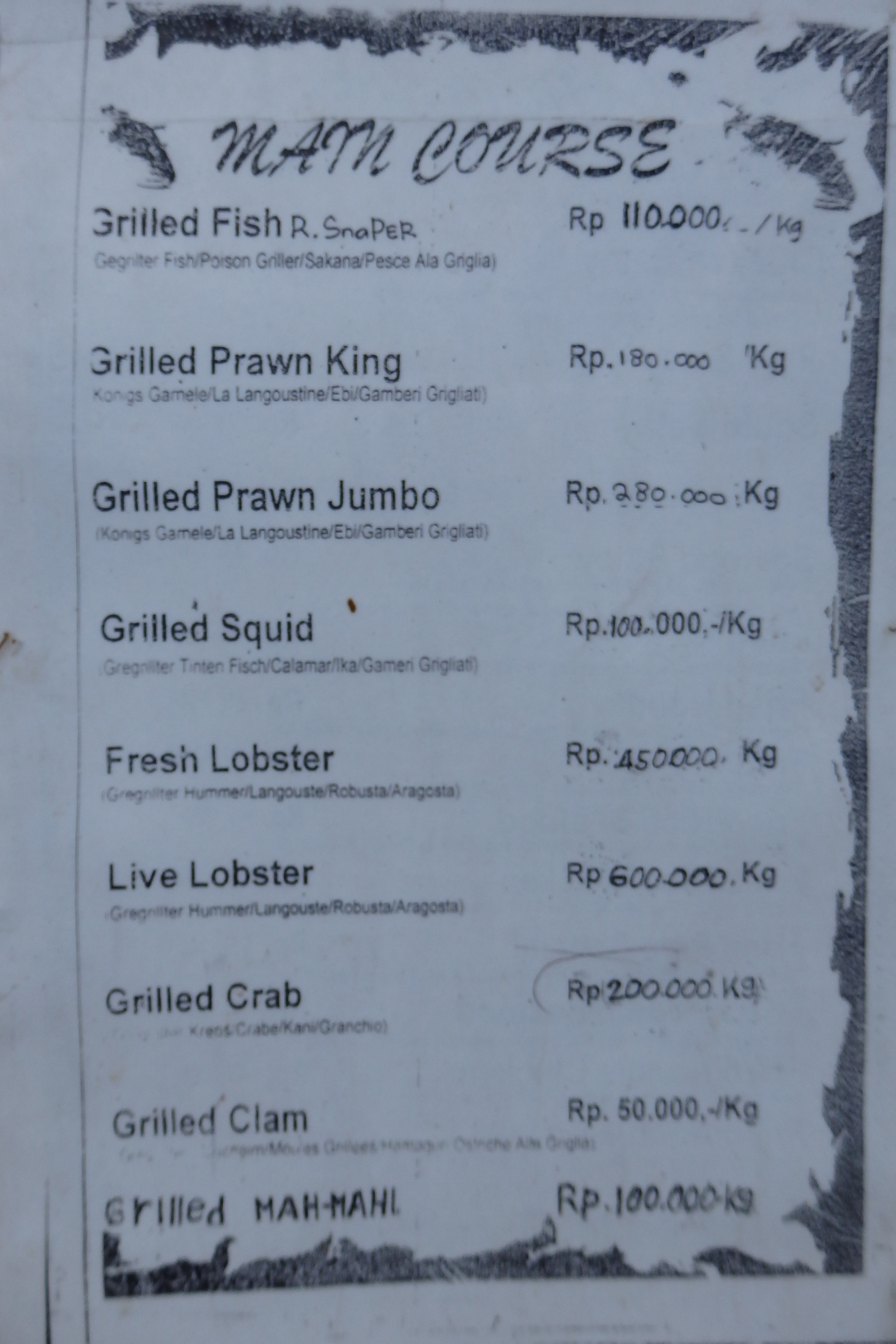 Lo primero que me llama la atención es que, efectivamente, el recepcionista no habla nada de inglés y que el lugar es bastante cutre. Me saca una lista de precios, con tres tipos de habitaciones. Una por 75 mil rupias, otra por 110 mil y otra por 300 mil.