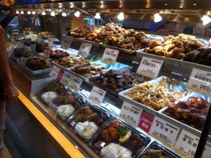 Otro de los puestos, este de carne. Los hay de todo tipo de comida (fideos, arroces, sushi, carne, pescado, dulces…). Me di cuenta de que los precios cuando los compre (a última hora, cuando ya me volvía), eran más baratos que por la mañana. Debe ser que los rebajan por llevar ya unas horas cocinados.